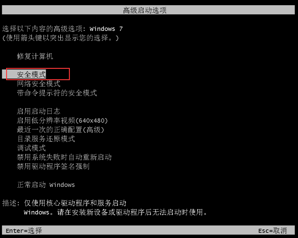 1、先长按电源键,使电脑关机。然后按电源键再次开机,到系统选择的界面,不要选择【正常启动windows】,选择【安全模式】。如果这里的菜单中有最后一次正常启动系统之类的选项,那么也可以尝试选择。