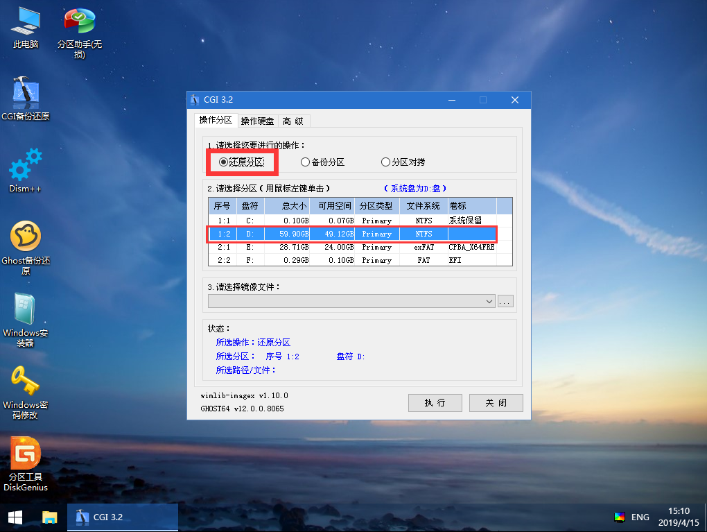 4、选择“还原分区“和选择需要还原的分区(安装系统之前请确认安装前C盘大小,根据磁盘大小确认需要还原发分区)