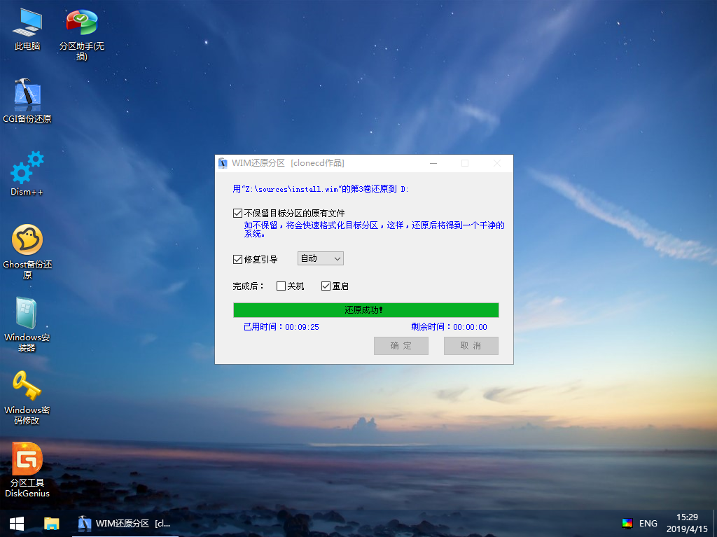 11、还原成功,自动重启进入系统安装界面(开始重启时,拔掉U盘)
