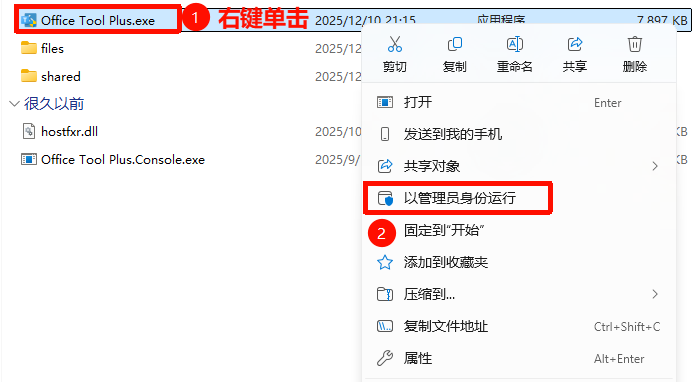 2. 下载完成后解压缩然后鼠标右键点击”Office Tool Plus”然后点击“以管理员身份运行”启动软件