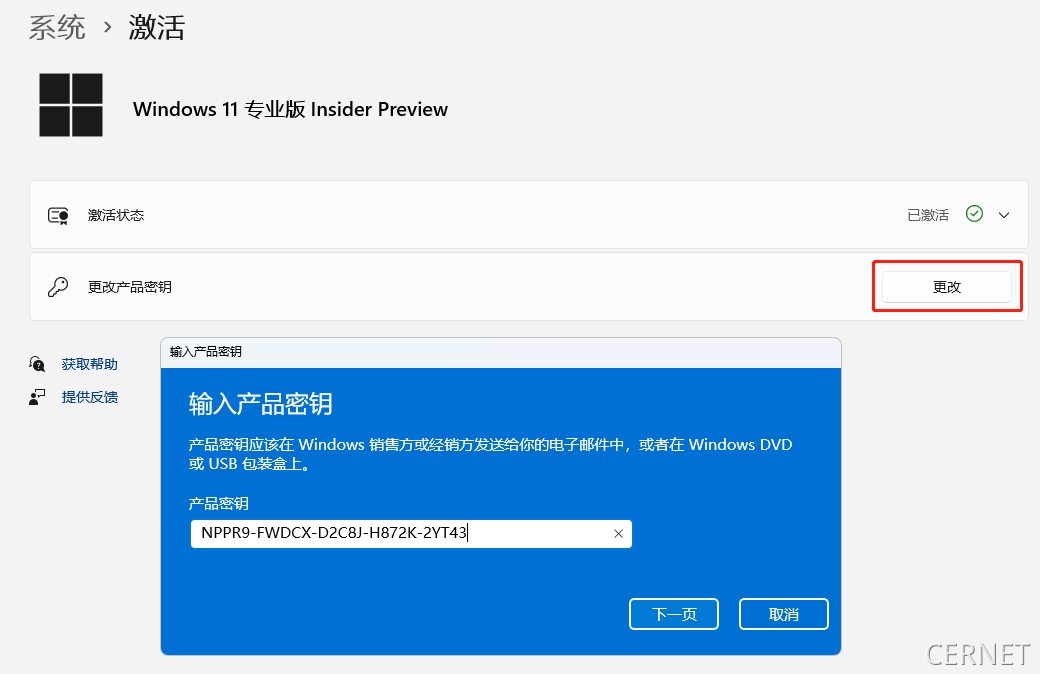 设置路径:设置>系统>激活>更改秘钥> NPPR9-FWDCX-D2C8J-H872K-2YT43