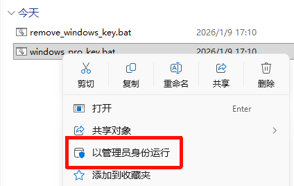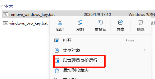 5.重启完成后右键 windows_pro_key.bat 文件点击以管理员身份运行