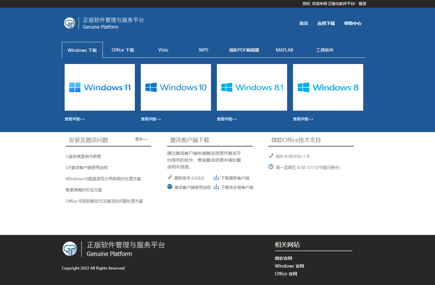 2. 安装激活客户端 1) 下载完成后双击运行安装程序 2) 点击“是”允许安装 3) 选择安装语言 4) 选择安装位置 5) 其余保持默认即可 3. 激活Windows和Office 1) 安装完成后会自动弹出登录界面,登陆后点击网页上登录客户端按钮。 2) 登录成功后,软件自动弹出商品激活管理窗口(Windows和Office默认各分配10次激活次数) 3) 点击左边的选项按钮,勾选需要激活的产品,然后点击“立即激活” 4) 激活完成后右下角会弹出激活成功或失败的提示 至此,Windows和Office的激活已完成,可以选择卸载或继续保留此激活客户端。