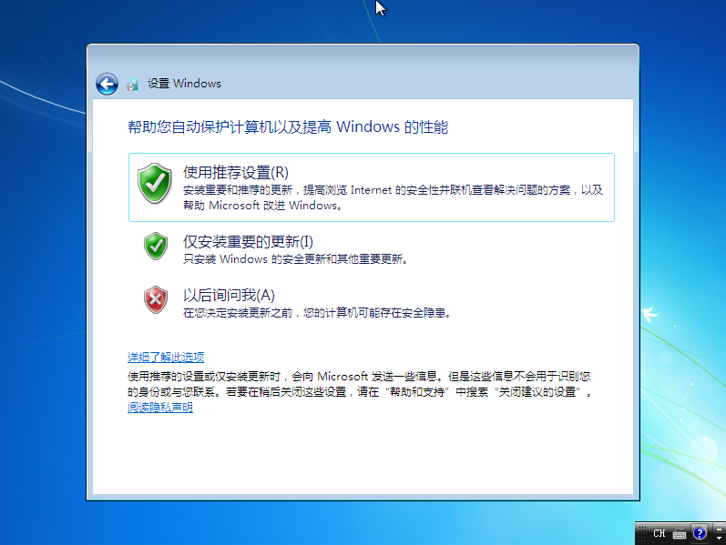 9. 设置更新方式,建议您选择第一项,以便系统得到及时的更新,确保系统安全