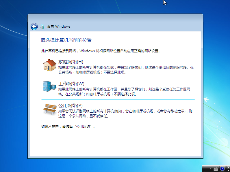 11. 如果您的电脑能上网,此时请选择网络类型。如果是您个人的电脑,或是家用电脑,请选择第一项“家庭网络”;如果是在工作单位,则选择第二项;如果上述情况都不是,请选择第三项